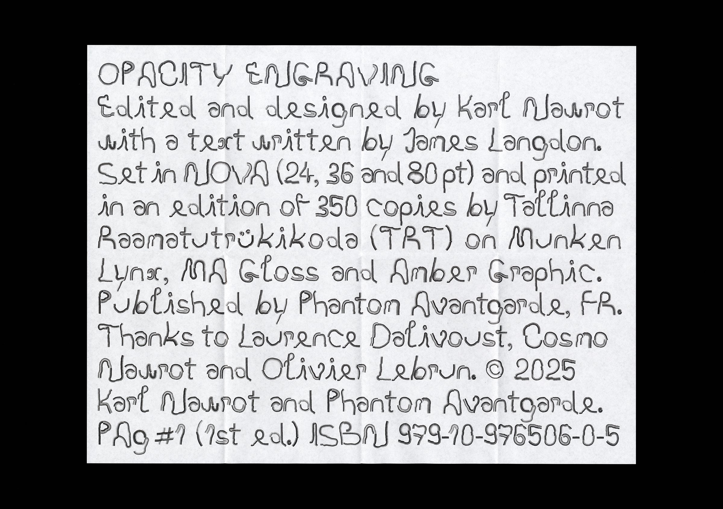 Text: James Langdon, design: Karl Nawrot, publisher: Yellow Pages, FR/CH, print: Stipa, FR, 250 copies.